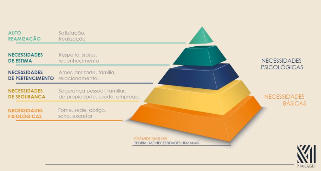 De acordo com a pirâmide de Maslow, existem cinco categorias nas necessidades humanas: